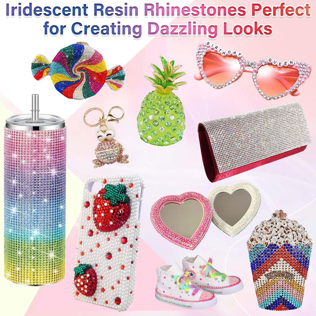 • Sparkling Iridescent Rhinestones: Ideal for creating dazzling looks. Use them for bedazzling crafts like shoes, tumblers, mugs, bottles, phonecases, bags, glasses, hats, masks, clothing, or nail art. A variety of colors and sizes are available for more possibilities.